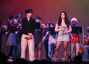 Commissioner of Assemblies Zachary Lee began the assembly by detailing his struggles with finding a Winter Formal date. After he contemplated the possibility of asking out his fourth cousin, junior Cinbie Chang took the stage to sing her rendition of the national anthem. Band then followed up with a performance of Christmas Medley.